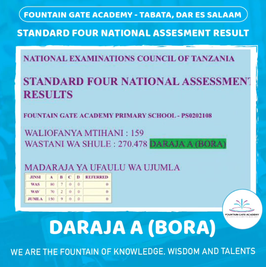 At Fountain Gate Academy in Tabata, 159 students participated in the assessment, achieving an outstanding average score of 270.478. This accomplishment translates into an overall Grade A classification, underscoring the hard work and dedication of both students and teachers.